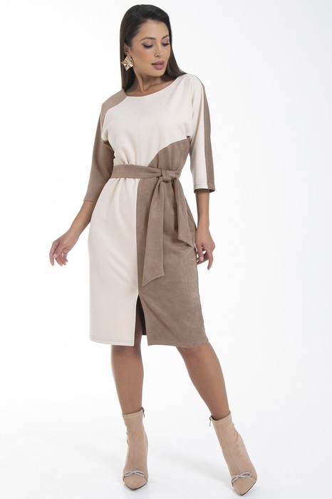 Восхищай! Красивое женское платье футляр с  рукавом 3/4 идеально впишется в деловой, повседневный и праздничный образ, эффектно смотрится на любой фигуре. Это готовый образ, который и смотрится хорошо, и является универсальным нарядом на все случаи жизни. Стильное комбинированное платье полуприлегающего силуэта с цельнокроеными рукавами и пикантным разрезом. Спинка из двух частей. Перед комбинирован из двух цветов.
