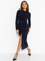 Стильное платье полуприлегающего силуэта  выполнено из трикотажной ткани, контрастные декоративные пуговицы визуально создают красивый акцент. Фасон интересен тем, что модельные линии, как нельзя лучше подчеркивают плавные изгибы женской фигуры. Вырез горловины классический овальный. Рукав втачной, полной длины.