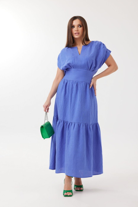 Платье женское, А-силуэта, со спущенной линией плеча и сборкой по плечевому шву. Горловина - лодочка. Перед с планками на центральной части и V-образным вырезом. Перед с широкой горизонтальной вставкой, на уровне талии, и сборкой в верхней части. По низу притачной волан со сборкой. В боковых швах карманы. На уровне линии талии завязки, которые вставлены в боковые швы.