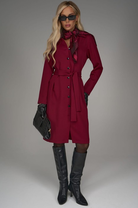 Элегантное платье-рубашка миди длины с акцентом на талию. Прямой силуэт корректируется поясом, создавая женственный образ. Классический отложной воротник и планка с пуговицами добавляют образу строгости и утончённости.