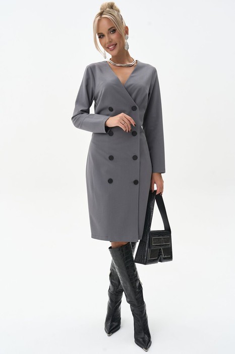 Стильное платье-пиджак прямого силуэта с акцентом на талию. Двубортная застёжка и строгий крой создают элегантный образ для офиса и деловых встреч. Модель выполнена из плотной костюмной ткани, хорошо держит форму и подчёркивает фигуру.