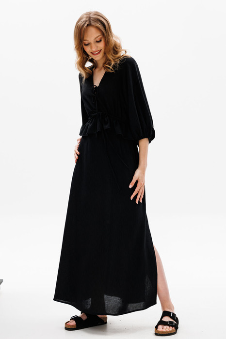 Платье выполнено из плательной ткани. Платье Х-образного силуэта, длиной миди, отрезное по линии талии. Горловина V-образной формы с завязками. На спинке в среднем шве застежка на потайную молнию. Плечевой шов укорочен. Рукав втачного покроя, одношовный, длиной 3/4 с вытачками по окату. Рукав расширен к низу, присборен на эластичную тесьму. Юбка расширена к низу. На заднем полотнище средний шов. В левом боковом шве обработан разрез.