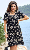 Платье выполнено из плательной ткани. Платье Х-образного силуэта. Центральная часть спинки собрана на венгерку. Рукав длиной до линии локтя, одношовный, расширенный. Верх и низ рукава обработаны эластичной тесьмой. Юбка расширена к низу. В боковых швах обработаны карманы. Юбка настрочена на лиф. Лиф платья на подкладке.