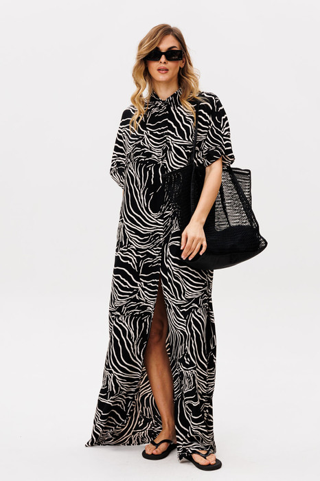 Платье выполнено из плательно-блузочной ткани с абстрактным принтом. Платье прямого силуэта, длиной в макси. Спереди центральная застежка до верха. Спинка цельная. Воротник стяче-отложной, с отрезной стойкой. Плечевой шов удлинен. Пройма углубленная.