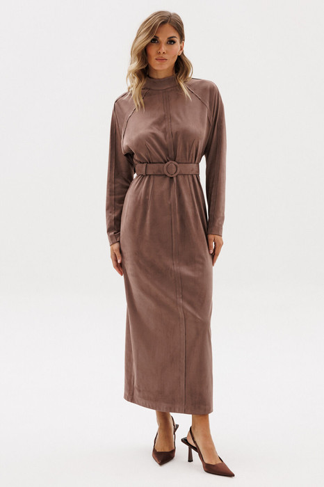 Платье выполнено из тонкой искуственной замши. Платье полуприлегающего силуэта, длиной миди. Платье отрезное по линии талии. Спереди  и на спинке талиевые вытачки и средний шов. Застежка на потайную молнию в среднем шве спинки. Воротник-стойка. Рукав покроя реглан. Средний шов переда, талиевые вытачки, верхний шов рукава и линии реглана обработаны "на лицо". В комплект входит съемный ремень из основной ткани с обтяжной пряжкой.