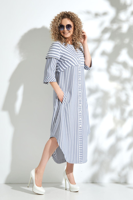 Платье – рубашка, выполнено из сочетания однотекстурных тканей- компаньонов. Горловина- округлая. Рукав втачной, низ рукава обработан декоративной манжетой. По переду расположены прорезные карманы- рамки. Низ- фигурный. длина изделия по центральному шву спинки 124. Длина рукава 42. Длина изделия по боковому шву до выреза (разреза) 75