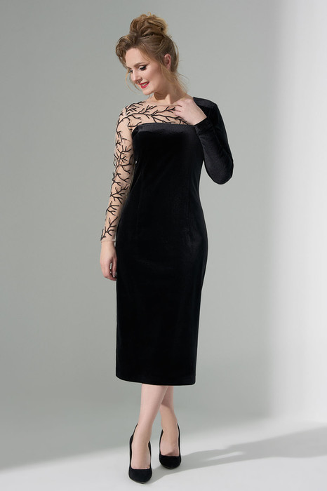 Платье женское  выполнено из велюра и прозрачной сетки. Изделие прилегающего силуэта. По горловине выполнен ассиметричный вырез со вставкой из сетки . На сетке по горловине и рукаву вышивка. Рукав втачной длинный, зауженный к низу. Длина рукава 55-57см.