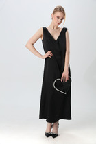 Платье женское свободного ассиметричного кроя, трапециобразного силуэта. Изделие с V-образным верезом горловины, на тонких лямках. По полочке изделия расположены нагрудные выточки и ассиметричный карман Низ изделия ассиметричный, фигурный с глубоким вырезом.