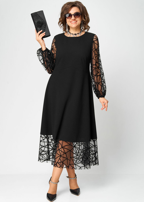 Платье шикарное женское нарядное вечернее полуприлегающего силуэта расширенное к низу, выполнено из плательного крепа в сочетании с сеткой с принтом в виде паутинки. Вырез горловины круглый на обтаке, по пинке застежка на навесную петлю и пговицу. Рукав втачной из сетки по низ собрн на резинку. Платье с фигурным подрезом по полочке, по низу притачной волан из сетки. Декором служит красивая нарядная отделочная ткань на рукавах и волане.
