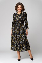 Платье женское нарядно-повседневное полуприлегающего силуэта до талии расширенное к низу. Плье отрезное по талии. Выполнено из креп-шифона. Вырез горловины отложной воротник с подбортами, до талии застежка на обметанные петли и пуговицы. Рукав втачной по низу собран на резинку. от талии юбка платья на трикотажной подкладке. Декором платья служит съемный пояс и принт самой ткани.