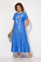 Платье женское нарядно-повседневное полуприлегающего силуэта расширенное к низу. Выполнено из хлопка в сочетании с шитьем. .Вырез горловины фигурный, воротник на стойке рубашечного типа. Рукав спущенный из отделочной ткани по низу с воланом собранным на сборку. Платье отрезное по лиии талии. Юбка ассиметричная с застежкой доверху на обметанные петли и пуговицы. По низу юбки притачной волан из отделочной ткани (шитье), в боковых швах обработаны карманы. Декором платья служит дизайн ткани,отделочные элементы из шитья. съемный пояс из основной ткани и отделочные пуговицы.