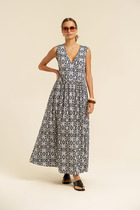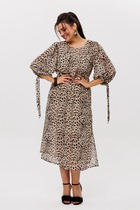 Платье женское нарядно-повседневное полуприлегающего силуэта расширенное к низу. Выполнено из хлопка. .Вырез горловины фигурный, воротник на стойке с фигурным вырезом. Рукав спущенный из отделочной ткани по низу с воланом собранным на сборку. Платье отрезное по лиии талии. Юбка ассиметричная с застежкой доверху на обметанные петли и пуговицы в боковых вах обработаны карманы. По низу юбки притачной волан из основной ткани. Декором платья служит дизайн ткани, съемный пояс из основной ткани и отделочные пуговицы.
