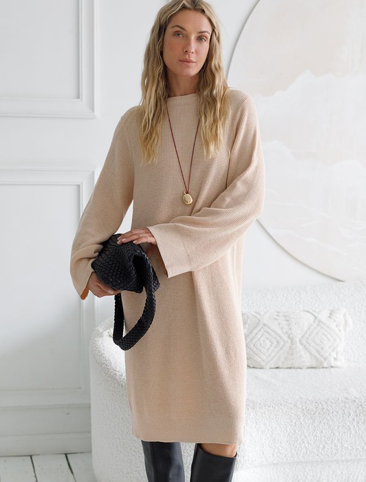 Состав: 70%Хлопок 21%ПА 9%Кашемир Плотность: 12 GG Размер товара на первом фото: 42Платье прямого силуэта фактурной вязки выполнено из хлопка с добавлением кашемира.