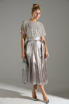 Платье с V-образным вырезом горловины, отрезное чуть выше линии талии, с коротким рукавом покроя-реглан имеет конструктивное решение в виде широких воланов с легкими сборками.