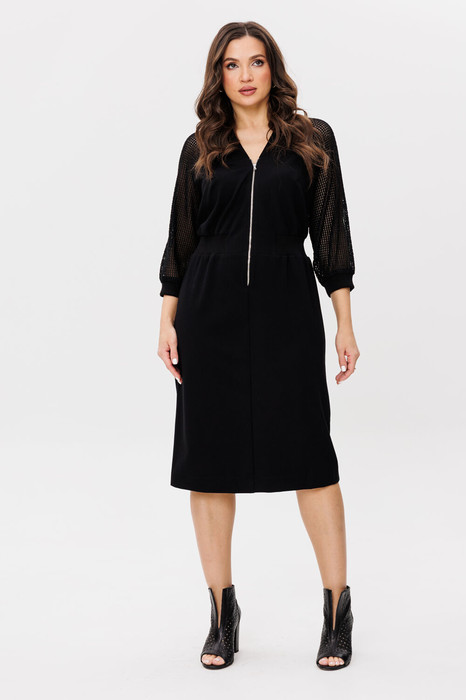 Полочка с нагрудными вытачками и центральным швом. Рукав из отделочной ткани. Линию талии подчёркивает трикотажное эластичное полотно в тон основной ткани, повышенной эластичности. Этим же отделочным полотном обработана горловина и манжета рукавов.