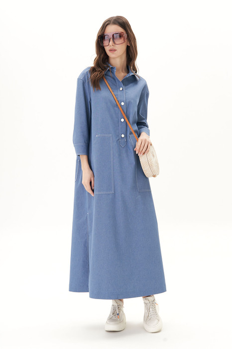 Платье свободного А-силуэта, рубашечного покроя с заниженной линией плеча, рубашечным воротником и рукавом. Полочка с частичной застежкой и накладными фигурными карманами. Спинка с отрезной кокеткой, средним швом и накладными задними карманами. Рукав с локтевой планкой и притачной манжетой с петлей и пуговицей. По боковым швам - разрезы. Все конструктивные элементы платья подчёркнуты контрастными отделочными строчками.