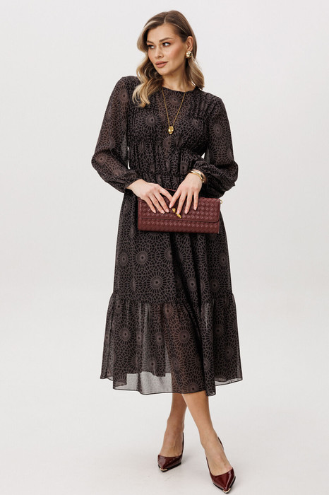 Легкое и воздушное, микс нежности и дерзости, воплощенный в комбинации противоположностей: нежного шифона и геометрического принта. А-образный силуэт, втачной рукав, со сборкой по низу, круглая горловина. Платье отрезное, чуть выше линии талии, лиф полочки с V-образным подрезом и легкой сборкой в боковой части на эластичную венгерку. Боковая часть на подкладке. Лиф спинки со средним швом и застежкой. По линии талии-эластичная тесьма.