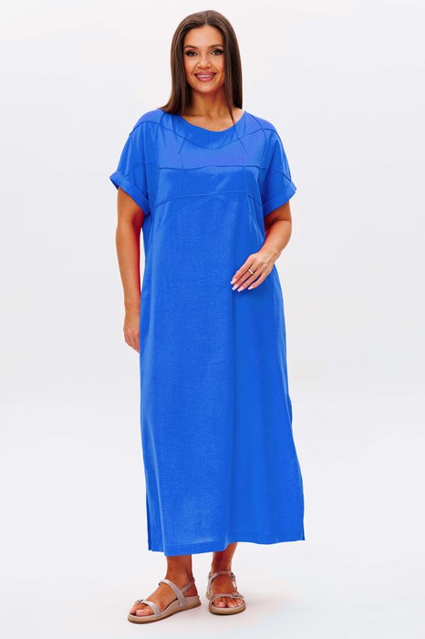 Такое платье-основа вашего летнего гардероба! Свободный упрямленный силуэт, цельнокроенный покрой. Полочка с отрезной кокеткой, изысканно декорированной строчками-защипами. Спинка с отрезной кокеткой и застежкой каплей. По низу рукава-отложной манжет.