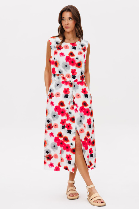 Платье из комфортного вискозного полотна, А-образного силуэта, без рукава, с эффектными отлетными деталями. Полочка с отрезным лифом с вытачкой, изящной драпировкой-поясом, и отлетными деталями на юбке. Спинка отрезная по линии талии, с частичной эластичной кулисой по центру спинки.