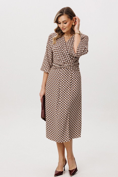 Полуприлегающий силуэт, втачной покрой, рукав длиной 7/8, отрезной лиф с запахом, юбка с запахом по переднему полотнищу. По линии талии по переду акцентная драпирующаяся деталь-перевертыш. По линии талии на спинке-эластичная тесьма.