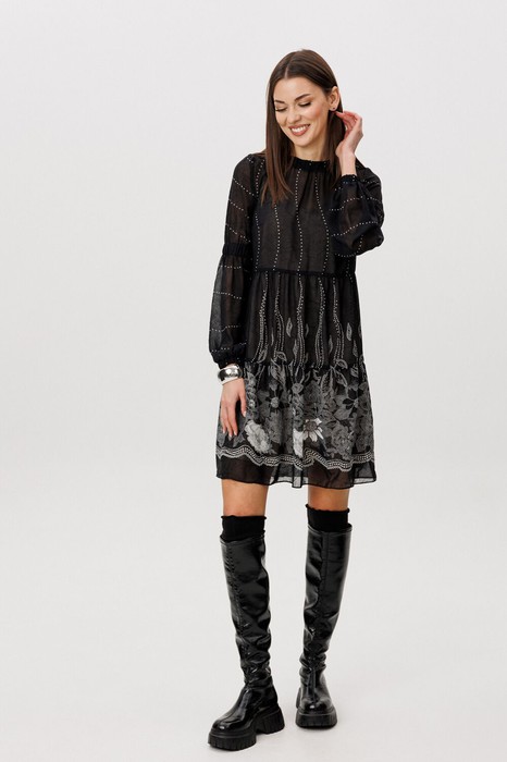 Шифон - это идеальная ткань для пошива весенних платьев. Платья, выполненные из этого материала, выглядят элегантно и игриво, особенно если это платье в романтическом стиле. Нежное и воздушное, с каскадом расширяющихся воланов с легкой сборкой, свободного силуэта. Рукав втачной из двух частей с эластичной тесьмой в верхней части и по низу. Горловина изделия с декоративной отделкой со сборкой. Длина изделия около 86 см. Длина рукава около 61 см.
