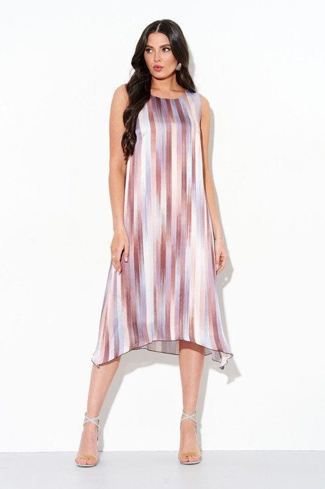 Платье прямого силуэта из плательного сатина на подкладке с антистатическим эффектом, вырез горловины округлой формы; низ платья ассиметричный. Рекомендована стирка при t не выше 30 С, Глажение при t  прессующей поверхности не выше 110 С.