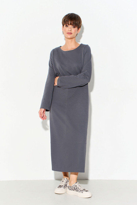 Стильное женское платье полуприлегающего силуэта со втачными рукавами выполнено из мягкого трикотажа футер 2-х нитка класс "пенье". По переду отделочные строчки, в боковом шве разрез. Изделие  полностью соответсвует заявленному размеру. Пожалуйста, пользуйтесь таблицей обмеров готового изделия.
