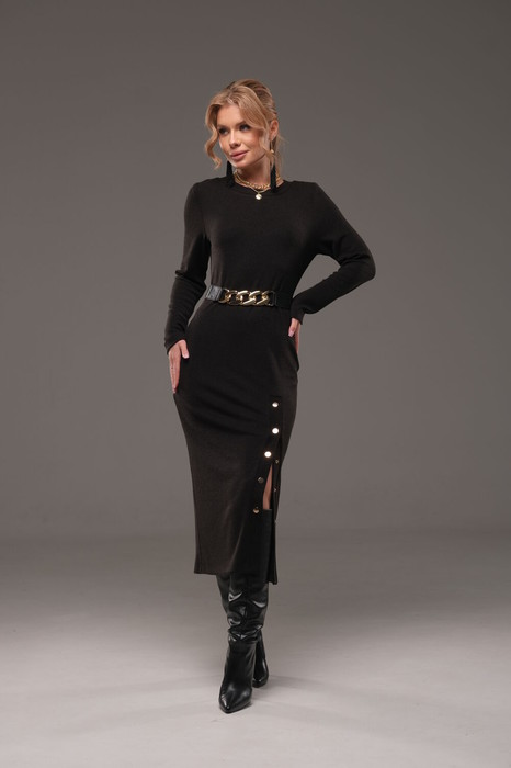 Платье трикотажное, прилегающего силуэта со средним швом по спинке с ремнем. Спереди на левой половинкк обработана планка, которая застёгивается на пять кнопок.