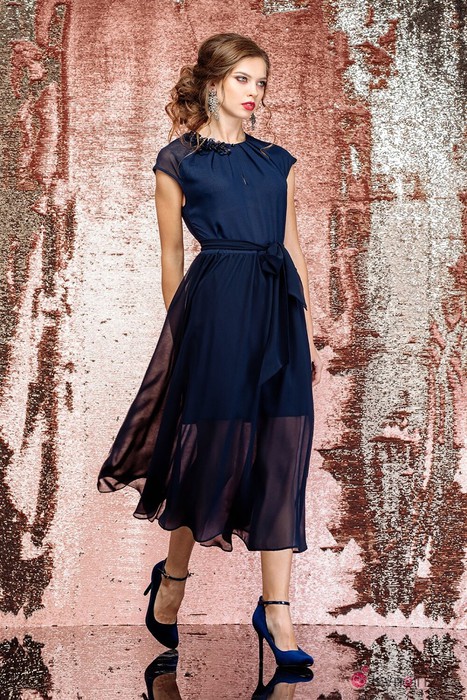 Платье женское нарядное. Силуэт полуприлегающий. Платье отрезное по линии талии. По горловине заложены складки, по одному плечу вставка из шифона и украшен декором. Спинка со средним швом с застёжкой на потайную молнию. От талии вставлена юбка из шифона на сборку. По талии съёмный пояс из шифона. Платье на подкладке от линии талии. Длина платья 122 см.