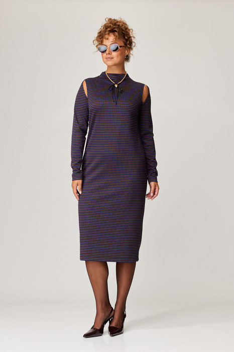 Платье слегка приталеного силуэта. Рукав втачной одношовный. Воротник небольшая цельнокроенная стойка. По переду - нагрудная вытачка, выходящая из бокового шва. По линиям втачивания рукавов спереди - фигурный вырез. Длина платья по середине спинки - 116 см, длина рукава - 63см.