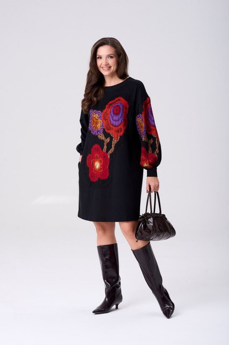 Платье свободного силуэта из трикотажной ткани с принтом. Рукав втачной одношовный со складками по низу и манжетой. В боковых швах карманы. Горловина обработана планкой в форме лодочки. По переду и по левому рукаву поверх принта настрочена сетка. Сетка может быть заменена с сохранением художественного образа изделия. Длина платья - 93 см , длина рукава платья - 53 см.