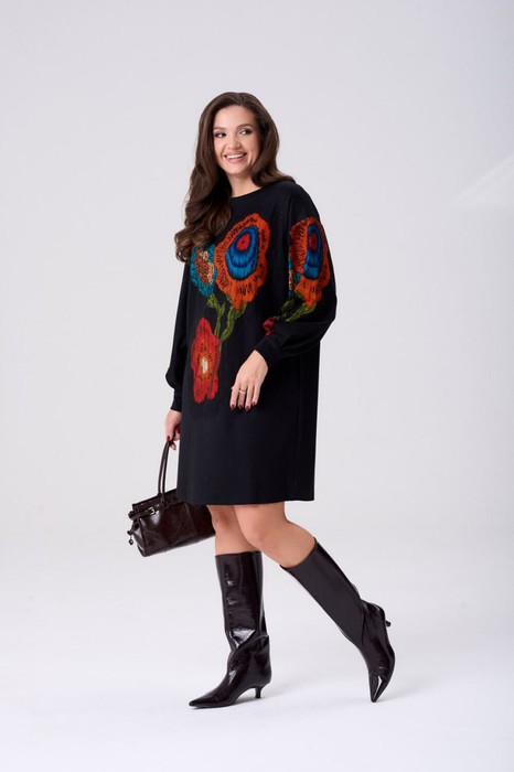 Платье свободного силуэта из трикотажной ткани с принтом. Рукав втачной одношовный со складками по низу и манжетой. В боковых швах карманы. Горловина обработана планкой в форме лодочки. По переду и по левому рукаву поверх принта настрочена сетка. Сетка может быть заменена с сохранением художественного образа изделия. Длина платья - 93 см , длина рукава платья - 53 см.
