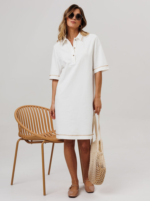 Платье прямого силуэта с воротником поло. Рукав втачной одношовный. По низу изделия, по низу рукава и по воротнику проложена отделочная строчка. Длина платья - 97 см, длина рукава - 30 см