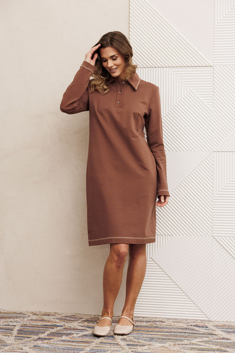 Платье слегка приталенного силуэта из плотного трикотажного полотна. Перед с застежкой поло и нагрудными вытачками. По воротнику и низу рукава настрочена декоративная тесьма. Длина платья 96 - см, длина рукава - 61 см.