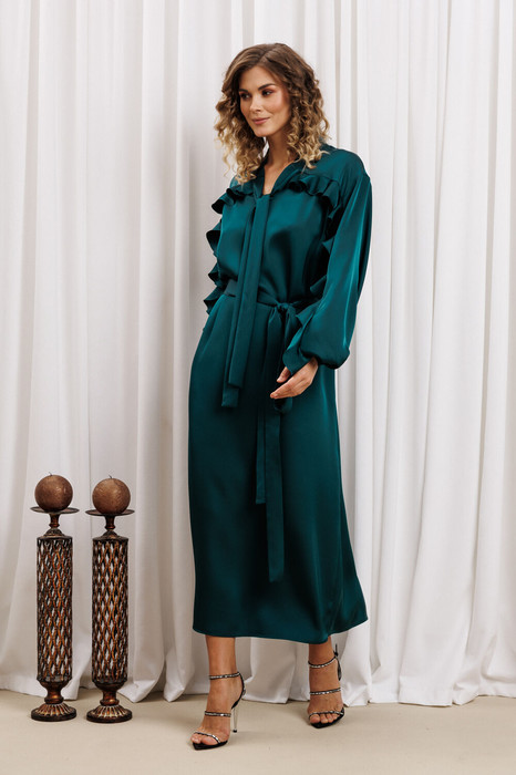 Платье свободного силуэта из струящейся атласной ткани. Перед и спинка с кокеткой и сборкой. Рукав спущенный свободный с резинкой понизу. Вдоль линии кокетки и рукава вставлена рюша. Горловина V-образной формы с воротником стойкой переходящей в бант. В боковом шве разрез. К платью прилагается пояс из основной ткани. Длина платья - 127 см, длина рукава - 60 см.