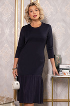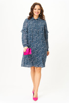 Платье без воротника , с V-образным вырезом горловины. Платье отрезное по линии талии. Полочки лифа переда располагаются на запах, с цельнокроенными завязками. Лиф спинки с талиевыми вытачками. Нижняя часть переда не закреплена к лифу, с центральной застежкой на петли и пуговицы. Шов по талии со стороны спинки присборен на резинку. Рукав втачной, короткий, с отрезной манжетой. Окат и шов притачивания манжеты присборен.