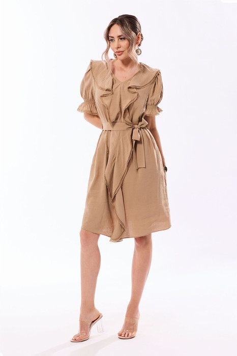 Платье, прямого силуэта, без застежки, без воротника, с V-образным вырезом горловины. По переду с нагрудными вытачками, втачным воланом по горловине переда и спинки, и по среднему шву переда. Спинка цельная. Рукав втачной, короткий, присборен по низу тремя строчками эластичной нитью . Окат рукава со сборкой. По краю воланов и низу рукава- отделочное кружево в цвет основной ткани. Платье со съемным поясом.