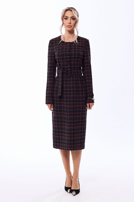 Платье без воротника, с круглым вырезом горловины, с центральной застежкой на петли и пуговицы по лифу переда и застежкой на потайную молнию по среднему шву спинки. Платье отрезное по линии талии. По лифу переда с рельефами, выходящими из проймы. Спинка со средним швом, заканчивающимся шлицей, по лифу спинки с рельефами, выходящими из проймы. Рукав втачной, длинный. Платье со съемным поясом, на боковых швах расположены шлевки для пояса.ф