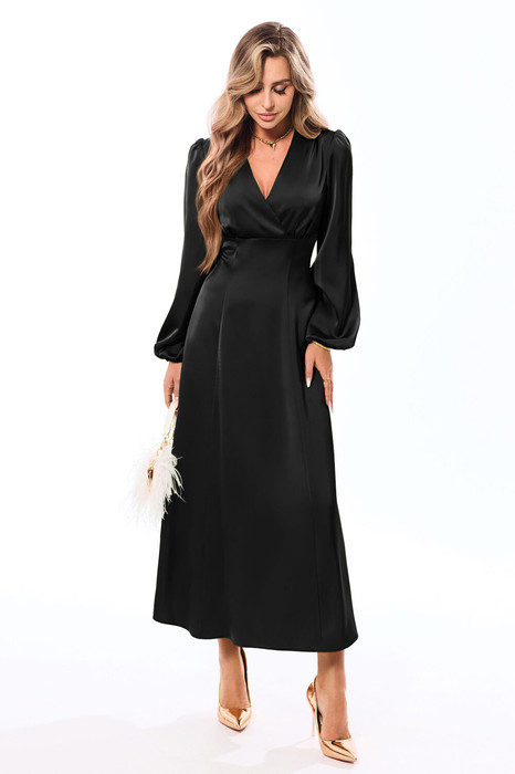 Платье, без воротника, с V-образным вырезом горловины, застежкой на потайную молнию в левом боковом шве. Платье отрезное по линии талии. Лиф переда с деталями на запах, со сборкой по плечевым и нижнему швам. Лиф спинки с частичной сборкой по низу. Рукав длинный, втачной, с отрезной манжетой, присборенной на резинку. Окат рукава со сборкой. Нижняя часть платья с двумя рельефными швами. Нижняя часть спинки со средним швом, двумя рельефными швами.