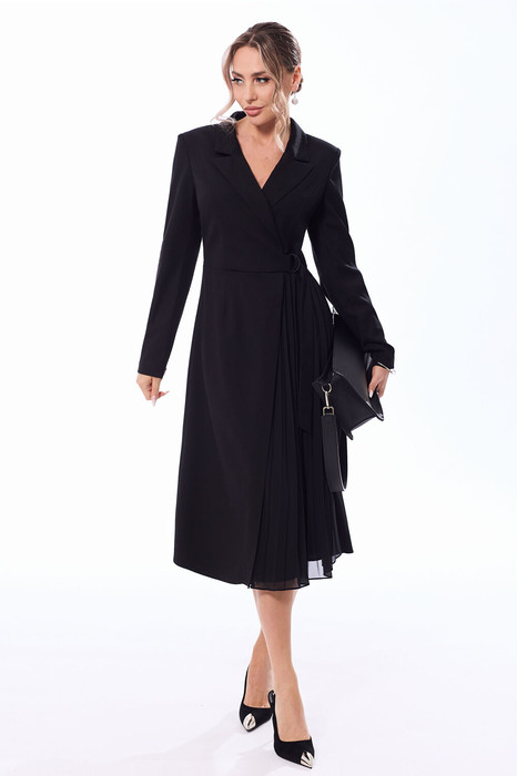 Платье с центральной двубортной застежкой по лифу переда на одну пришивную кнопку и на потайную молнию в правом боковом шве, втачным воротником и отложными лацканами. Платье отрезное по линии талии. По лифу переда- рельефы, выходящие из проймы. Нижняя часть переда с асимметричной вставкой- гофре. По линии талии- декоративный пояс- завязка на полукольцах. Спинка со средним швом, талиевыми вытачками. Рукав втачной, длинный.