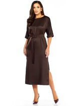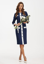 Платье с центральной застежкой на петли и пуговицы, на широких бретелях. Платье отрезное по линии талии. Верхняя часть переда с талиевыми вытачками, нижняя часть переда с карманами и односторонними складками по талии. Нижняя деталь спинки с талиевыми вытачками. Платье со съемным поясом.