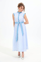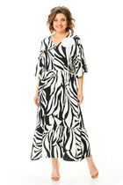 Платье, с застежкой на потайную молнию по среднему шву спинки, без воротника, с фигурным вырезом горловины. Платье отрезное по линии талии. Нижняя часть платья состоит из двух воланов. Лиф переда с рельефами, выходящими из горловины. Лиф спинки со средним швом, рельефами, выходящими из горловины. Рукав втачной, длинный, с отрезной манжетой. Окат и шов притачивания манжеты присборен. Платье со съемным поясом.