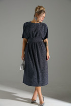 Платье, с застежкой на потайную молнию по среднему шву спинки, без воротника, с фигурным вырезом горловины. Платье отрезное по линии талии. Нижняя часть платья состоит из двух воланов. Лиф переда с рельефами, выходящими из горловины. Лиф спинки со средним швом, рельефами, выходящими из горловины. Рукав втачной, длинный, с отрезной манжетой. Окат и шов притачивания манжеты присборен. Платье со съемным поясом.