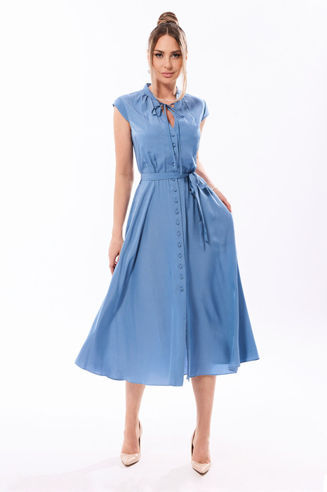 Платье с центральной застежкой на петли и пуговицы, с отрезным воротником- стойкой, рукав- крылышко. Платье отрезное по линии талии. Шов по талии присборен на резинку. По горловине переда- шнур- завязка. В боковых швах расположены карманы. Платье со съемным поясом.