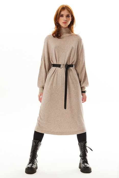 Платье прямого силуэта, свободного кроя, с отрезным воротником- стойкой. Рукав втачной, длинный, с отрезной манжетой. Плечо спущенное. Платье со сьемным поясом.