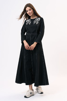 Платье с застежкой на потайную молнию в среднем шве спинки, без воротника, с квадратным вырезом горловины. Платье отрезное по линии талии. По верхней части переда рельефы, выходящие из горловины. Спинка со средним швом, талиевыми вытачками. Нижняя часть платья расклешенная. Рукав втачной, длинный. Платье со съемным поясом.
