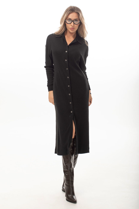 Платье прямого силуэта с отложным воротником, центральной застежкой на петли и пуговицы. Спинка цельная. Плечо спущенное. Рукав втачной, длинный, с отрезной манжетой.