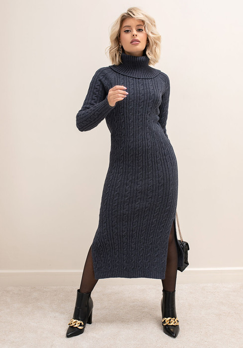 Вязаное платье с косами прямого покроя полуприлегающего силуэта длиной до середины голени с разрезами по бокам. Рукав покроя реглан стандартной длины (на рост 170см). Вырез горловины круглый расширенный с высоким воротником типа «хомут». Платье связано переплетением на базе резинки и из-за этого может варьироваться длина изделия. Это связано с свойством трикотажа - при поперечном натяжении укорачиваться по длине. При стандартных обхватах соответсвующих размерам по ГОСТ 17522-72 о типовых фигурах женщин, длина платья будет как на моделях на фото при условии совпадения по ростовке. Рост моделей на фото 166 см.