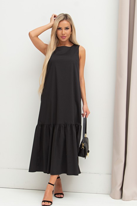 Летнее платье А - силуэта. Округлая горловина на внутренней обтачке. По спинке застежка на потайную молнию. В боковых швах функциональные карманы. Низ оформлен притачным воланом.