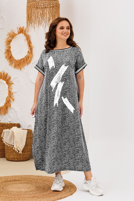 Платье женское свободного силуэта в стиле «боххо», вырез горловины округлый с декоративной трикотажной резинкой. Изделие без рукава со спущенной линией плеча и отделкой по низу. В боковых швах карманы и фигурные разрезы по низу. Декором является принт по полочке. По спинке – имитация планки с пуговицами. Платье без застежки. Длина платья 122 см.